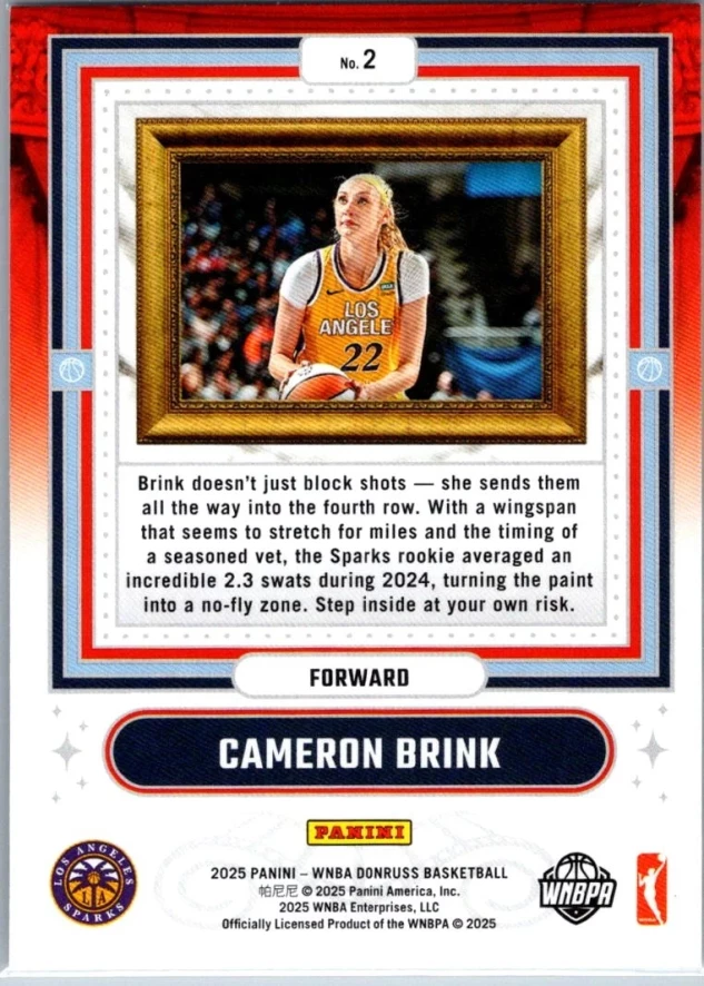 This is a nice example of a 2025 Donruss WNBA #2 Cameron Brink Franchise Features