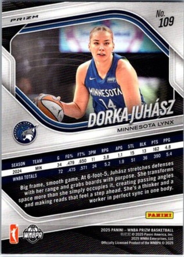This is a nice example of a 2025 Panini Prizm WNBA #109 Dorka Juhasz WNBA Logo Prizms