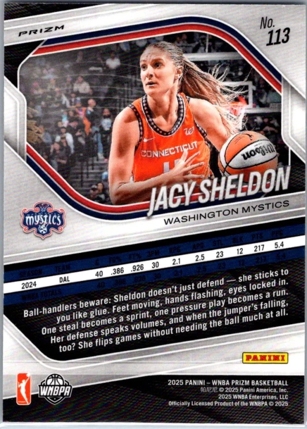 This is a nice example of a 2025 Panini Prizm WNBA #113 Jacy Sheldon WNBA Logo Prizms