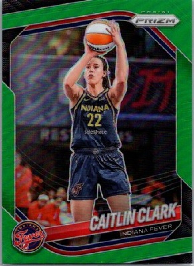 This is a nice example of a 2025 Panini Prizm WNBA #22 Caitlin Clark Green Prizms