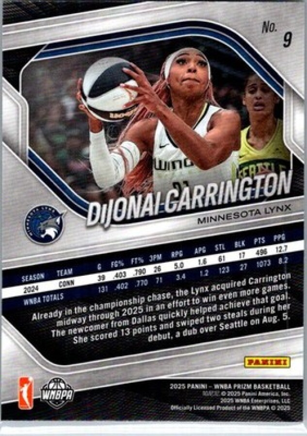 This is a nice example of a 2025 Panini Prizm WNBA #9 DiJonai Carrington