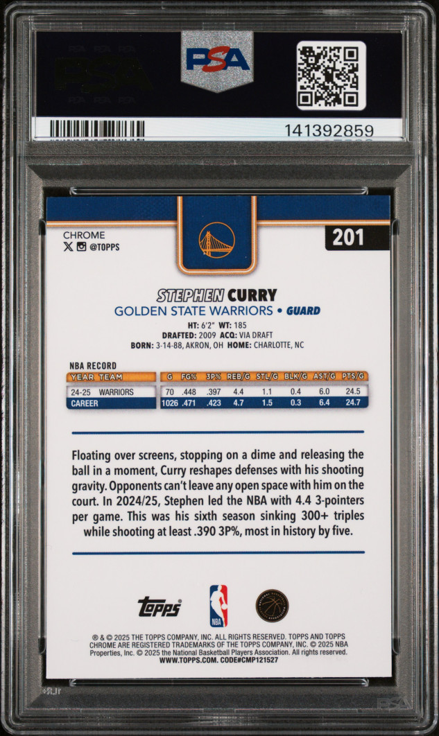 The product is a 2025 Topps Chrome Prism Refractor trading card featuring basketball player Stephen Curry. This card, numbered 201, has been professionally graded as a PSA 9 MINT, ensuring its high quality and authenticity. With its sleek design and rarity as a refractor parallel, this card is sure to be a prized possession for any basketball card collector.