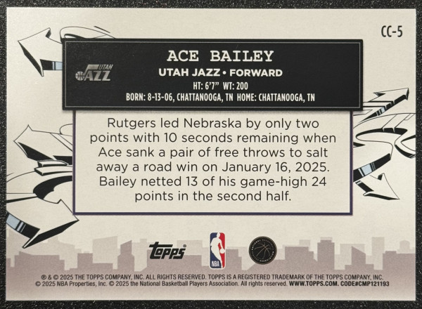 You are purchasing a 2025 Topps Clutch City Prospects Ace Bailey #CC-5 - Utah Jazz RC. You will receive the exact item in the photographs. Thank you for looking.