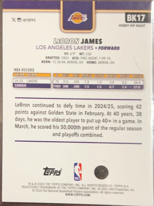 You are purchasing a 2025 Topps Hobby Rip Night LeBron James #BK17. You will receive the exact item in the photographs. Thank you for looking.