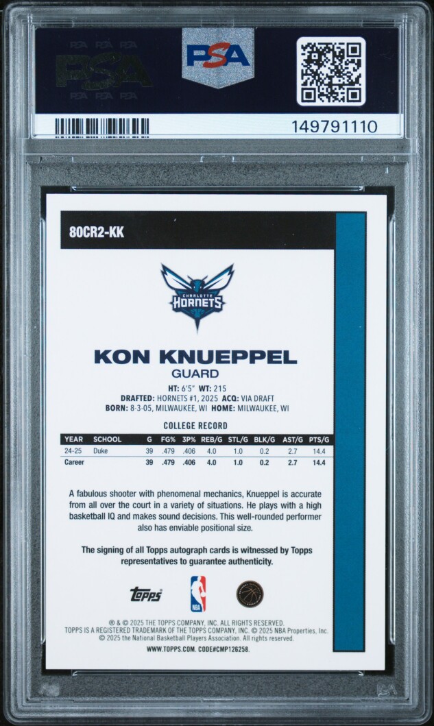 You are purchasing a 2025 Topps Silver Pack 1980-81 Topps Chrome Basketball Rookie Autographs Kon Knueppel #KK PSA 10. You will receive the exact item in the photographs. Thank you for looking.