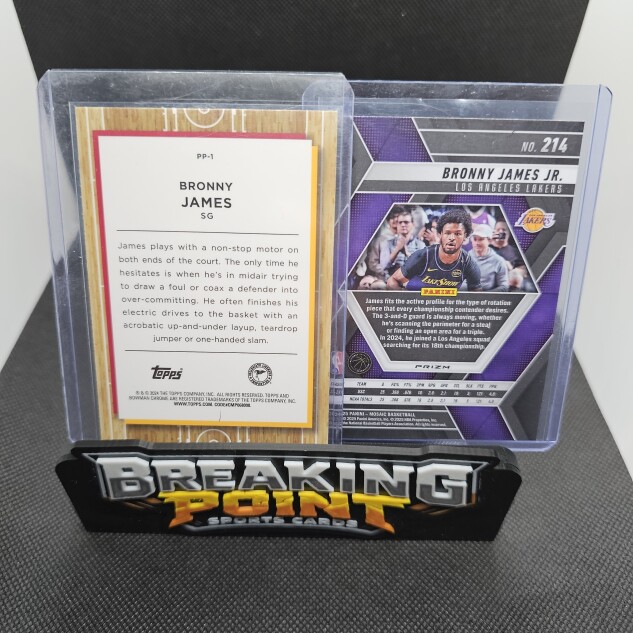 You'll get cards. 2024 Panini Mosaic - Rookies Bronny James #214 Silver Prizm and 2023-24 Bowman University Chrome - Prodigal Playmakers Bronny James