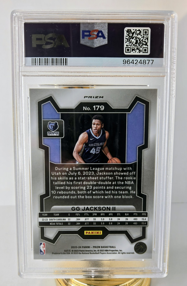 The product is a highly sought-after 2023-24 Panini Prizm Ice Prizm #179 trading card featuring rookie player Gg Jackson of the Memphis Grizzlies in the National Basketball Association (NBA). This collectible card from Panini is part of the base set and belongs to the Ice Prizm parallel variety, adding a unique and desirable element to any basketball card collection. With its pristine condition and limited availability, this card is a valuable addition for fans and collectors alike.