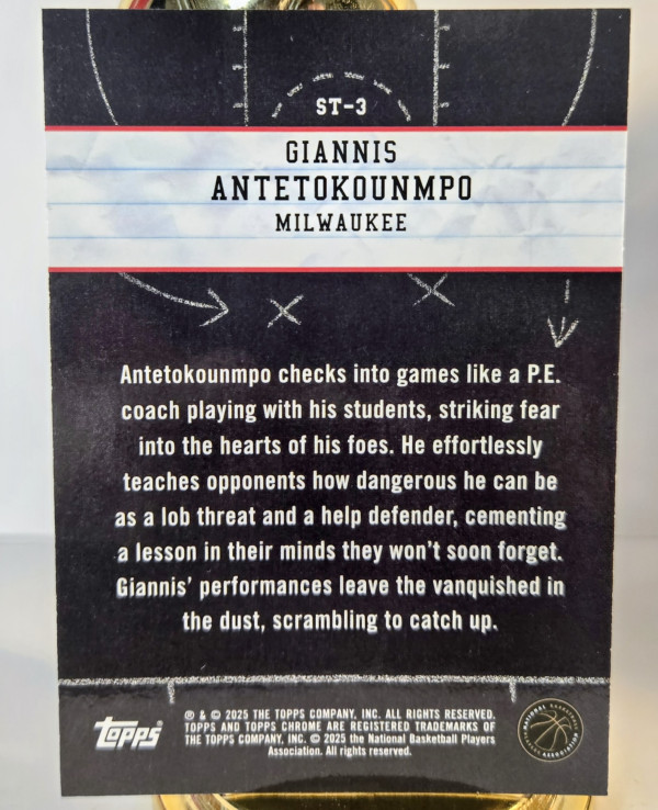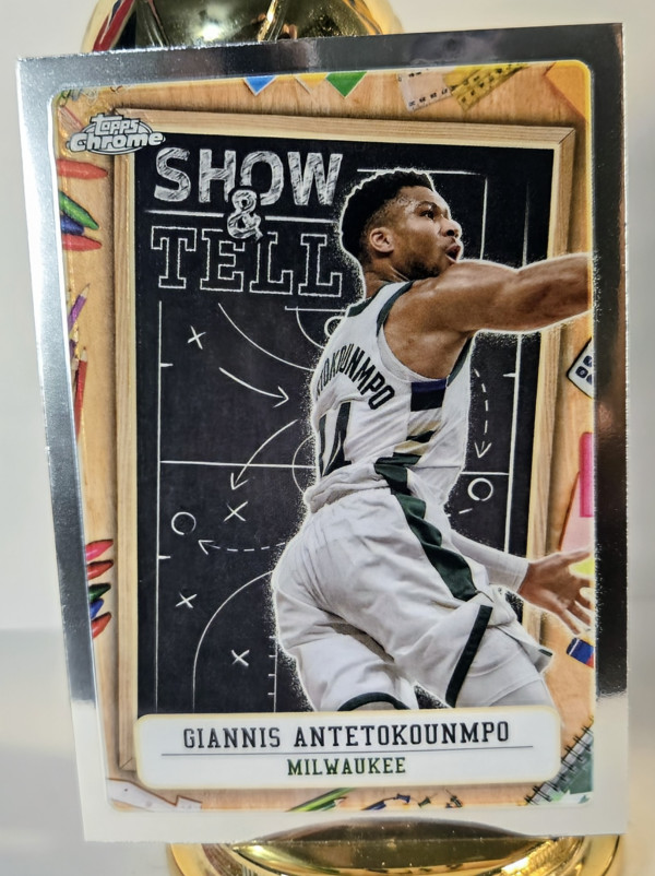 The product is a 2024-25 Topps Chrome Show And Tell trading card featuring Giannis Antetokounmpo of the Milwaukee Bucks in the National Basketball Association (NBA). Manufactured by Topps, this insert card is part of the Show and Tell set, showcasing unique and artistic designs. As a highly collectible item, this card is a must-have for fans and collectors of sports trading cards, especially those who admire the skills and style of Giannis Antetokounmpo.