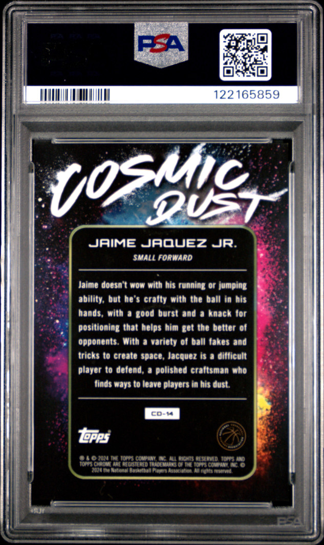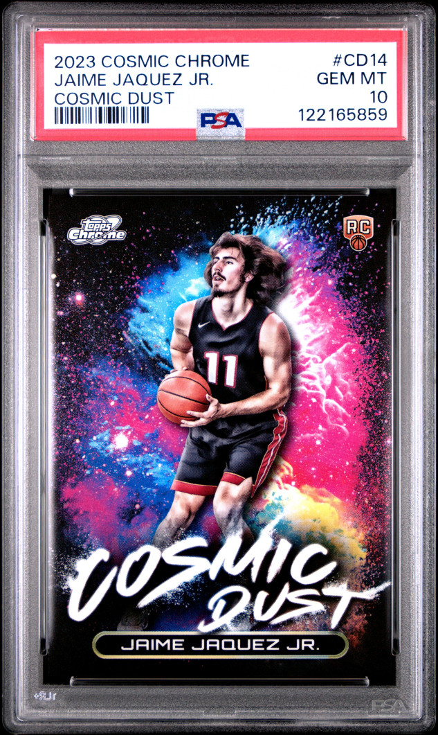 The Jaime Jaquez Jr. 2024-25 Topps Chrome Cosmic Dust PSA 10 SSP RC #CD14 trading card is a highly sought-after collectible featuring the rookie player from the Miami Heat in the NBA. This limited edition card from the Topps Chrome Cosmic Basketball set showcases a unique Cosmic Dust parallel variety, making it a rare find for fans and collectors. Authenticated by Panini Authentic, this card is a case hit with hologram features, adding to its value and appeal. Made of high-quality card stock and manufactured in the United States, this original sports trading card is a must-have for any basketball card enthusiast.