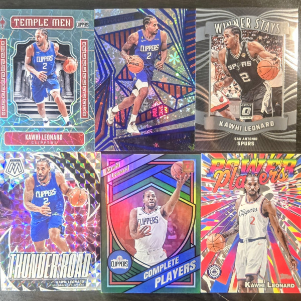 The product is a collection of 6 basketball trading cards featuring Kawhi Leonard, a prominent player in the National Basketball Association (NBA). These cards include various features such as parallel and insert cards, and belong to the 2023-24 season. The collection includes cards from the '20-21 Donruss series, '23-24 Teal Lazer Phoenix series, and '24 Mosaic series, among others. Kawhi Leonard is known for his time playing for both the Los Angeles Clippers and the San Antonio Spurs, making this a desirable set for fans and collectors of sports trading cards.