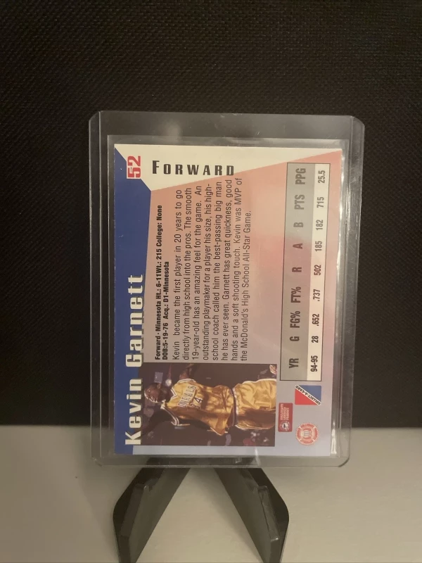 Up for auction is a 1995 Collect-A-Card Pro Draft #52 sports trading card featuring Kevin Garnett of the Minnesota Timberwolves. This original, red foil parallel/variety card is made of high-quality card stock material and is serial numbered. It is perfect for any National Basketball Association (NBA) fan or collector. The card is standard size and is not autographed or a vintage reprint. The card is licensed and manufactured in the United States. The season is 1995 and it is a base card.
