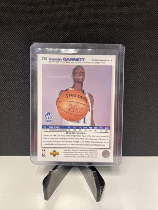 This is a 1995-96 Upper Deck Collector's Choice sports trading card featuring Kevin Garnett, a basketball player for the Minnesota Timberwolves. The card is made of card stock material and is an original from the manufacturer. It is a base set rookie card with card number 275.