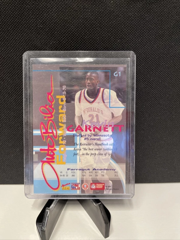 This Kevin Garnett basketball trading card is a part of the 1995 Signature Rookies Autobilia set. The card features Kevin Garnett, a professional basketball player from the Minnesota Timberwolves team, with card number G1. It is made of card stock material and is a standard size trading card.