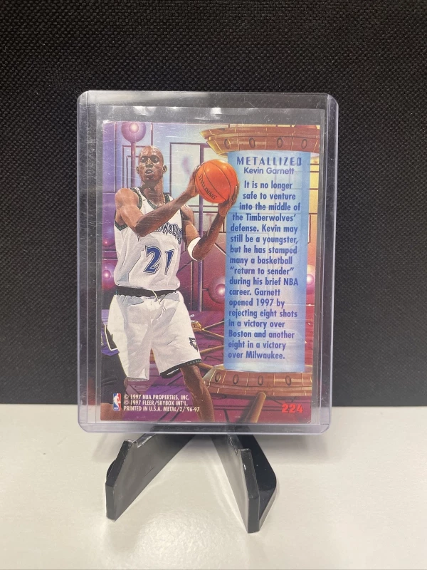 Get your hands on this highly sought-after Kevin Garnett 1996 Fleer Metal #224 sports trading card. This original and licensed reprint is made of high-quality card stock and features the Minnesota Timberwolves player in his prime. The card is part of the base set of 1996 Fleer Metal and is a must-have for any NBA or basketball fan.