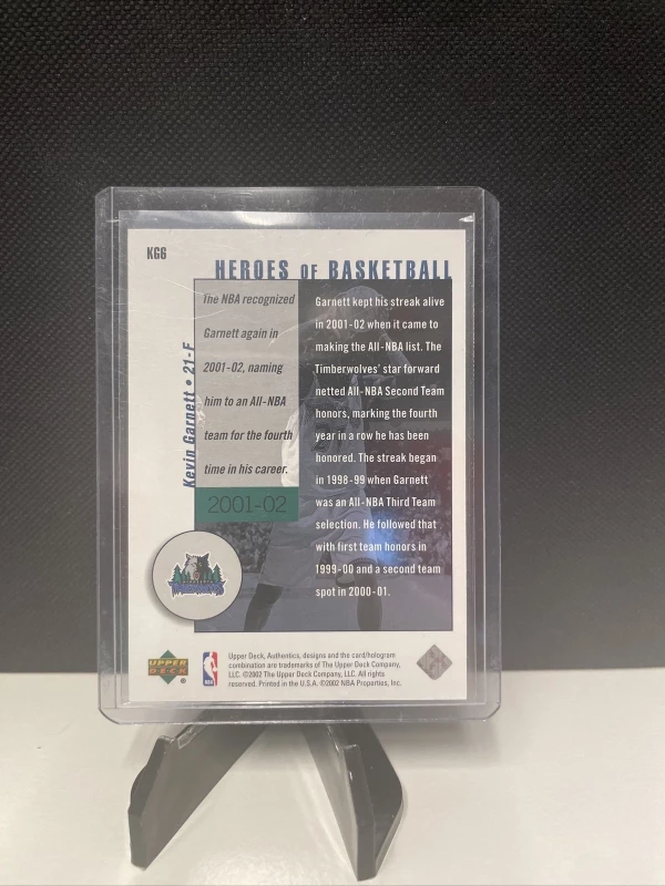 This Kevin Garnett 2002 UD Authentics Heroes of Basketball card is a must-have for any NBA fan or card collector. It features a standard size and is made of high-quality card stock material. The card is an original, not a licensed reprint, and is parallel/variety base.