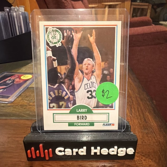 The product is a 1990 Fleer trading card featuring NBA legend Larry Bird from the Boston Celtics. This original card is made of card stock and is part of the base set for that year. It is a standard-sized card with the card number #8, perfect for basketball fans and collectors looking to add a piece of sports history to their collection.