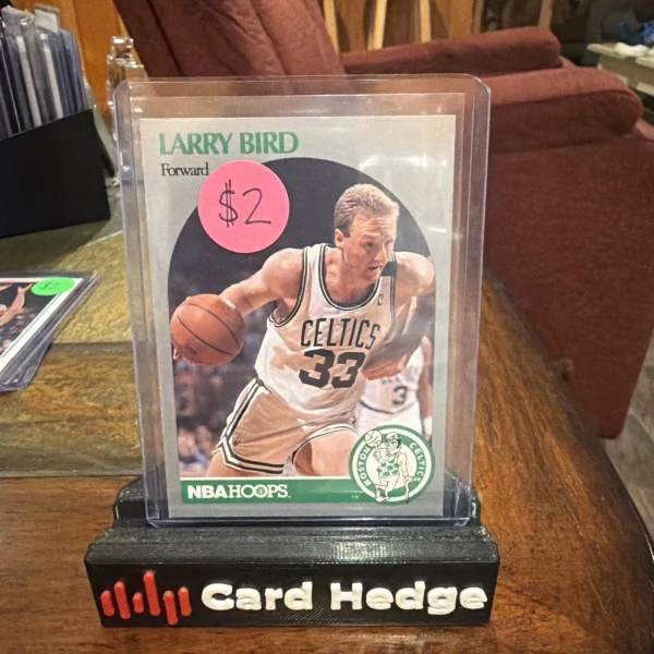 The Larry Bird 1990 Hoops #39 trading card is a standard size card featuring the iconic player from the Boston Celtics during the 1990-91 NBA season. Manufactured by NBA Properties in the United States, this original card is part of the base set of 1990 NBA Hoops cards. With no autograph but still highly collectible, this basketball trading card is a must-have for fans and collectors of Larry Bird and the NBA.