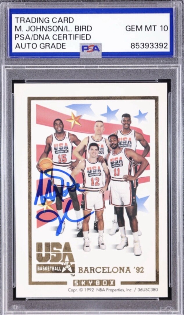 🔥Larry Bird & Magic Johnson Signed 1991-92 Skybox USA Team Card #NNO, PSA 10