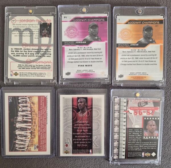 2023 Upper Deck Goodwin Champions - Platinum Michael Jordan Pink Wave. 2023 Upper Deck Goodwin Champions Orange Michael Jordan. 1998-99 Upper Deck Michael Jordan Living Legend. 1999-00 Upper Deck MVP Michael Jordan 1991-92 NBA Hoops #543 NBA Champions Chicago. 1997-98 Upper Deck Jordan Tribute Reflections