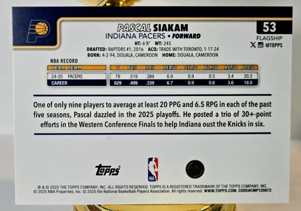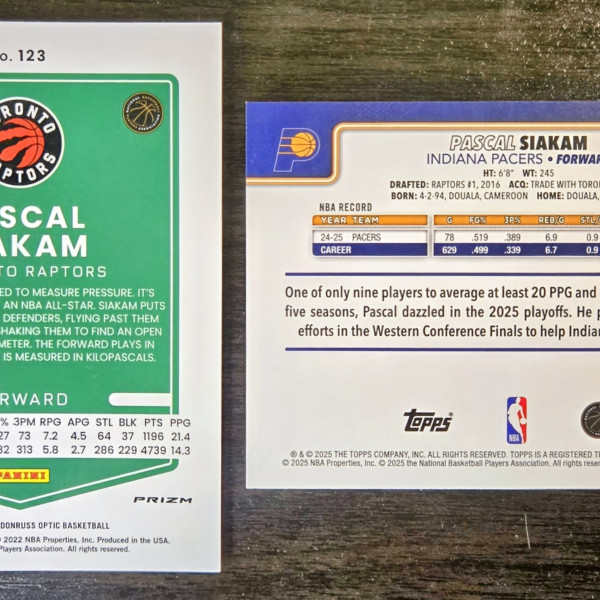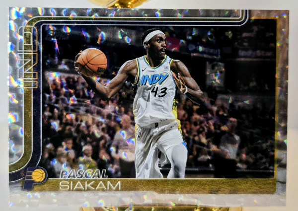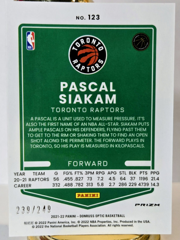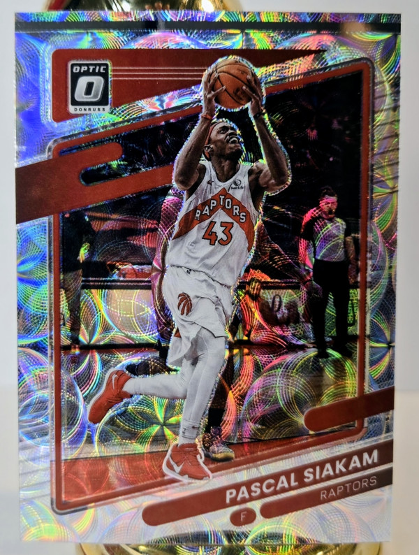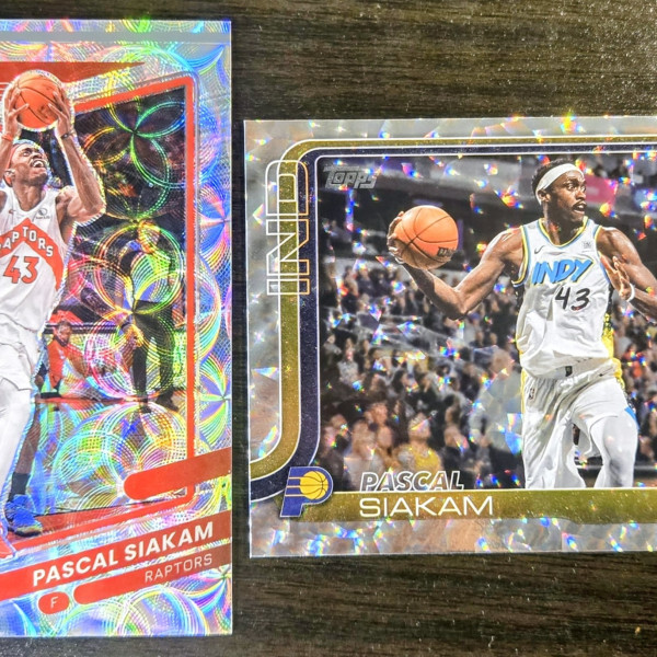 The product is a limited edition Pascal Siakam trading card set, including a '21 Donruss Optic Premium Box Set card numbered 239/249 and a '25 Topps Diamante card. Manufactured by Panini, these cards are highly sought after by basketball card collectors. With features like being serial numbered, parallel, and insert cards, these items offer unique and valuable additions to any sports trading card collection. Perfect for fans of the Indiana Pacers or Toronto Raptors, these cards showcase the dynamic skills of NBA player Pascal Siakam.