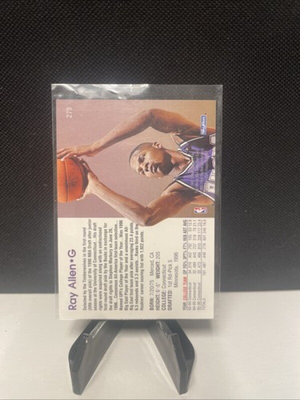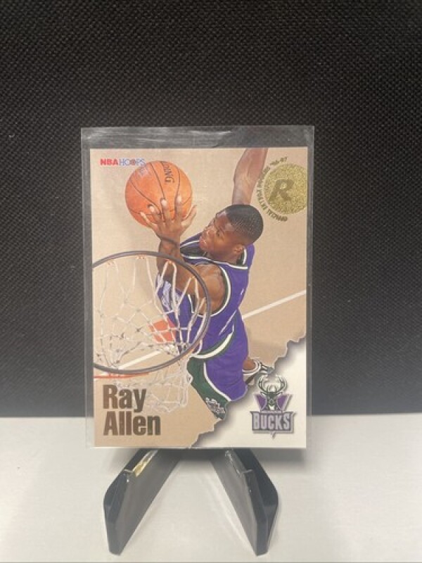 This Ray Allen 1996 NBA Hoops #279 RC trading card is a must-have for basketball fans and collectors alike. Featuring the Milwaukee Bucks player in his rookie year, this original SkyBox card is made of high-quality card stock and is part of the 1996-97 NBA Hoops set.