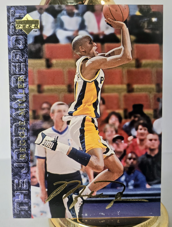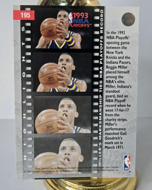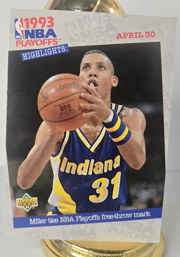 The product is a lot of Reggie Miller trading cards, including a 1994 Upper Deck card, a 1993 Upper Deck Philadelphia trade card, and two 1996 Texaco USA basketball cards. These sports trading cards feature the basketball player Reggie Miller, who played for the Indiana Pacers in the NBA. The cards are from different sets and are considered insert cards, meaning they were included in larger packs or sets of trading cards. This lot would be a valuable addition to any basketball card collection for fans of Reggie Miller and the Indiana Pacers.