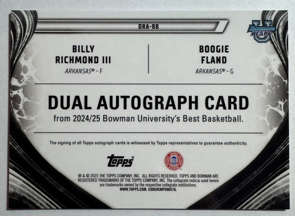 The Topps Bowman University Best Red Refractor Dual Auto card featuring Billy Richmond III and Boogie Fland is a highly sought-after collectible with a limited print run of only 5. This hard-signed card is a standard size trading card made of card stock and is part of the 2024-25 Bowman University Best set. Authenticated by Topps, this original card is a valuable addition to any sports trading card collection, especially for fans of the National Collegiate Athletic Association (NCAA) basketball league and the Arkansas Razorbacks team.