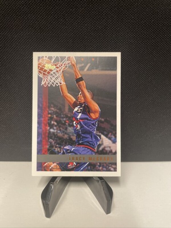 This sports trading card features Tracy McGrady, a former basketball player for the Toronto Raptors. It is a 1997 Topps #125 RC rookie card made of card stock material. The card is an original and not a licensed reprint.