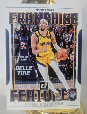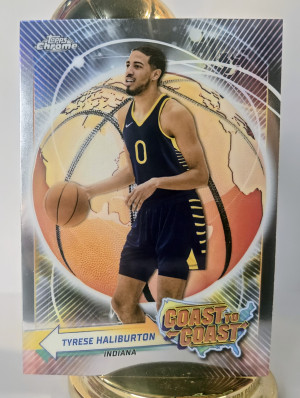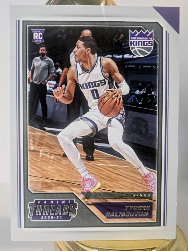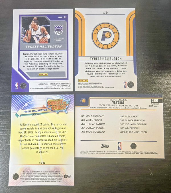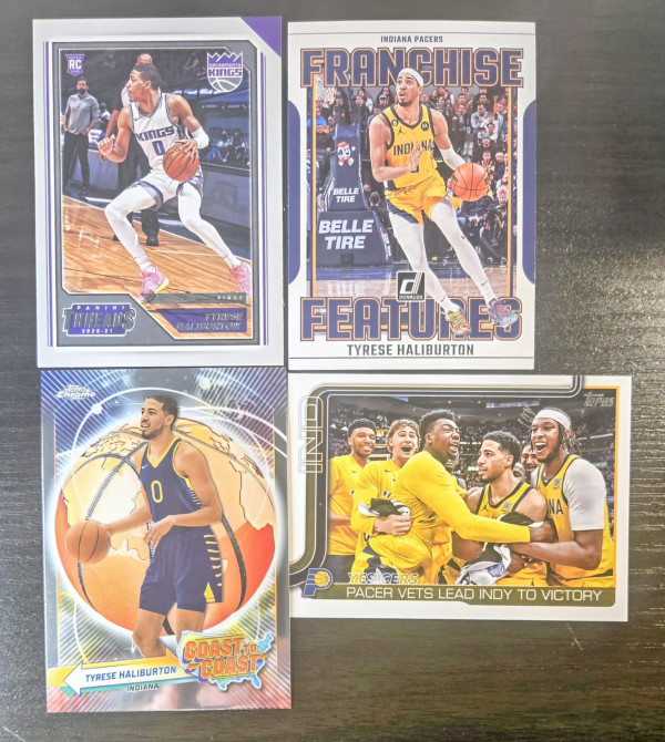 The product is a collection of four basketball trading cards featuring Tyrese Haliburton, a player in the National Basketball Association (NBA). The cards are from different seasons, including his rookie year, and are categorized as 'Threads Rookie Card (RC)', 'Future Frame' (FF), 'Coast To Coast' (C2C), and '25 Yes'cers. These cards are part of the sports trading card market and are sure to be a valuable addition to any basketball card collection.