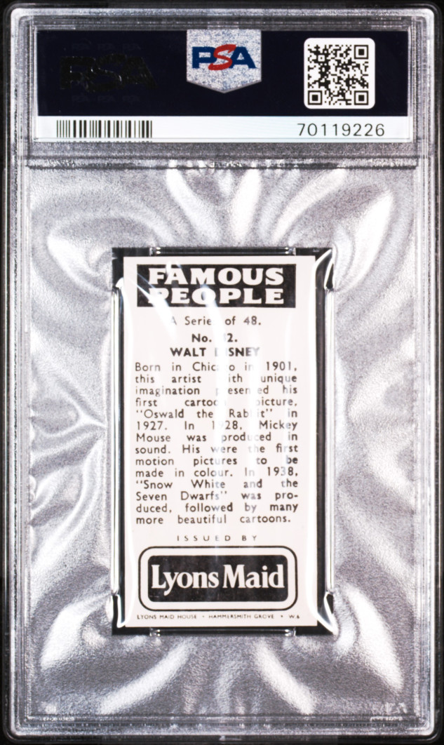 You are purchasing a 1966 Lyons Maid Famous People Walt Disney #42 Famous People PSA 10. You will receive the exact card in the photographs. Thank you for looking. Listed with Mascot.