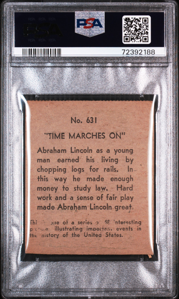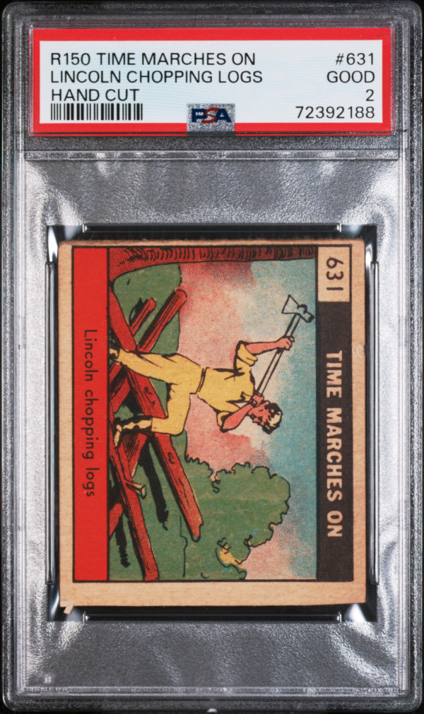 You are purchasing a 1930 R150 Time Marches On-Hand Cut Lincoln Chopping Logs #631 Hand Cut PSA 2. You will receive the exact card in the photographs. Thank you for looking. Listed with Mascot.