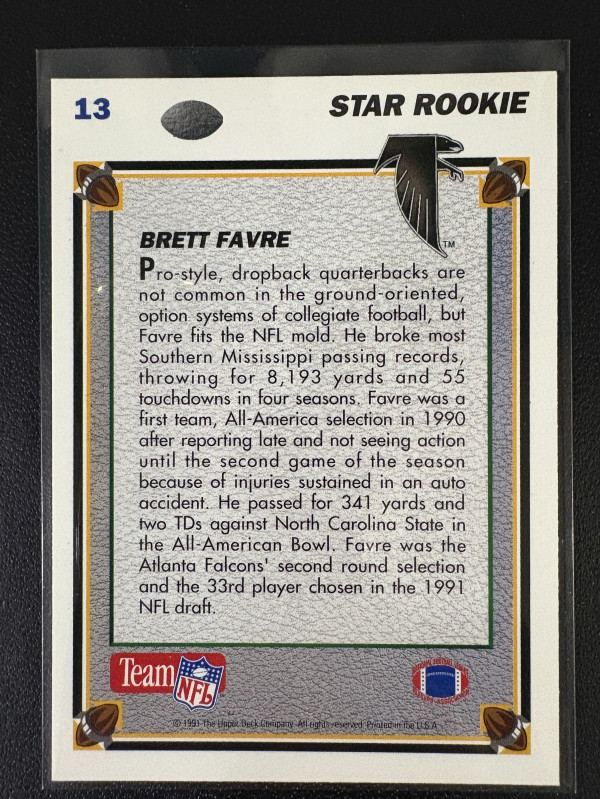 You are purchasing a 1991 Upper Deck Brett Farve rookie card #13. You will receive the exact item shown in the photographs. Thank you for your interest.