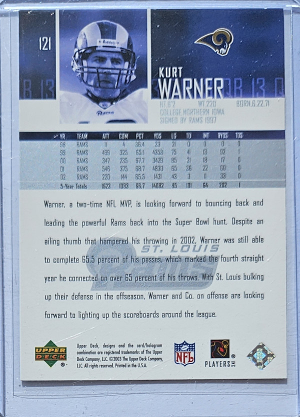 2003 UpperDeck Kurt Warner #121. *Card will ship in protective sleeves and a cardboard box, I do not ship using PWE or BM. (WAS930)