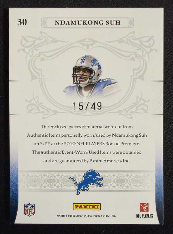 You are purchasing a 2010 Playoff National Treasures NFL Gear Prime #30 Ndamukong Suh 15/49. Upon purchase you will receive the exact card pictured. Thanks!
