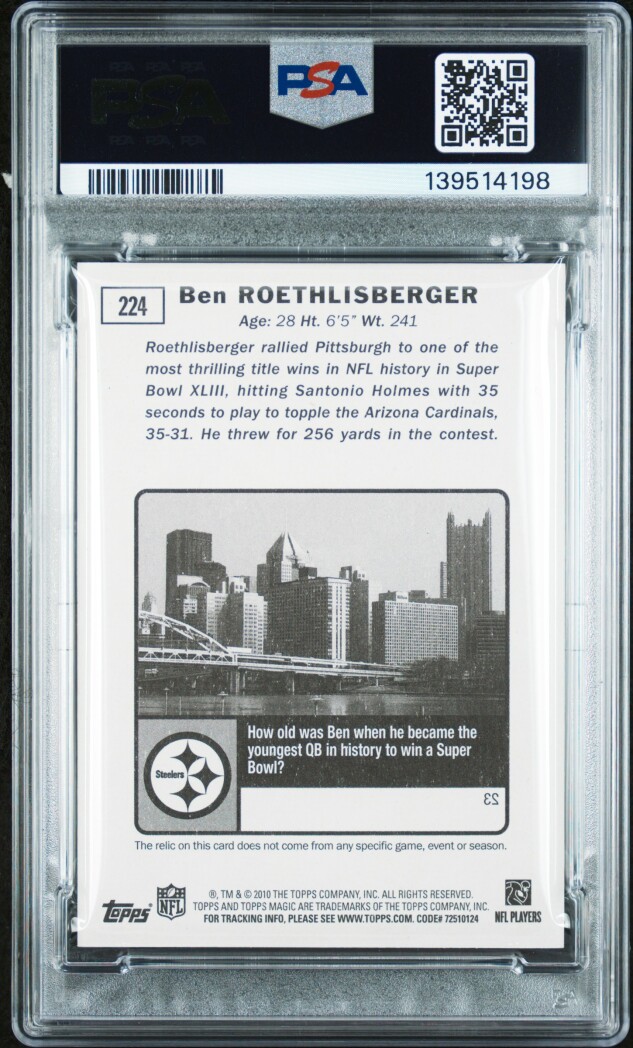 You are purchasing a 2010 Topps Magic Ben Roethlisberger Relic PSA 9. You will receive the exact item in the photographs. Thank you for looking.