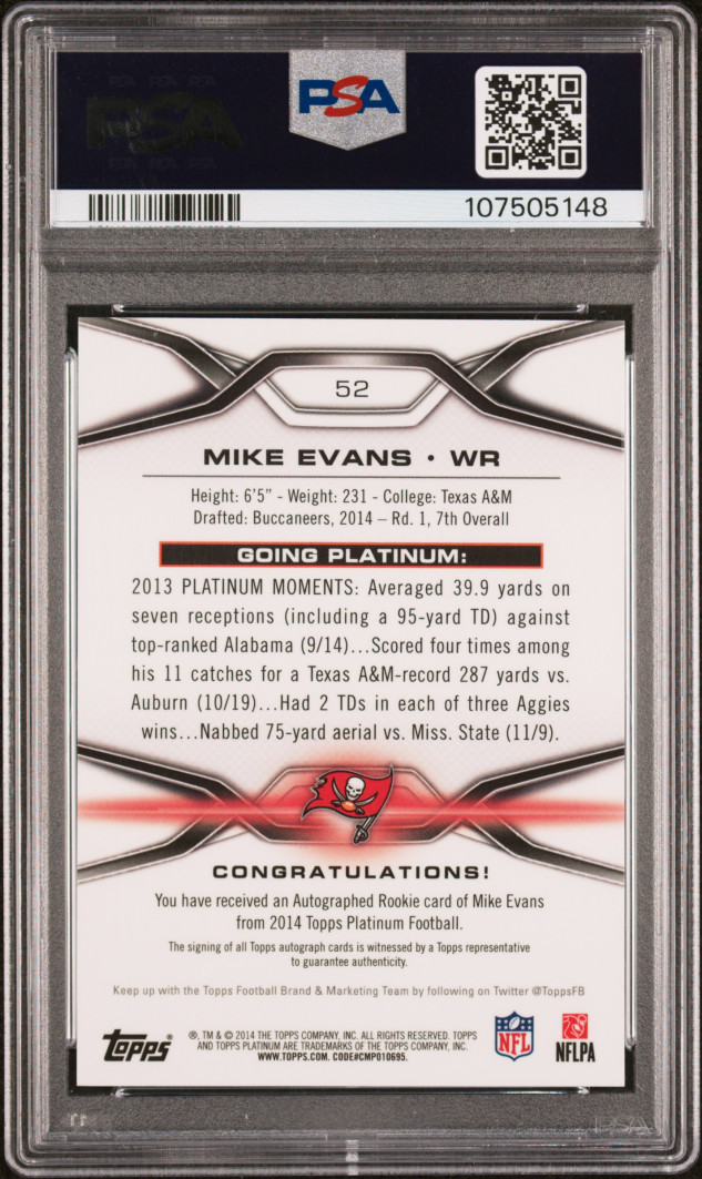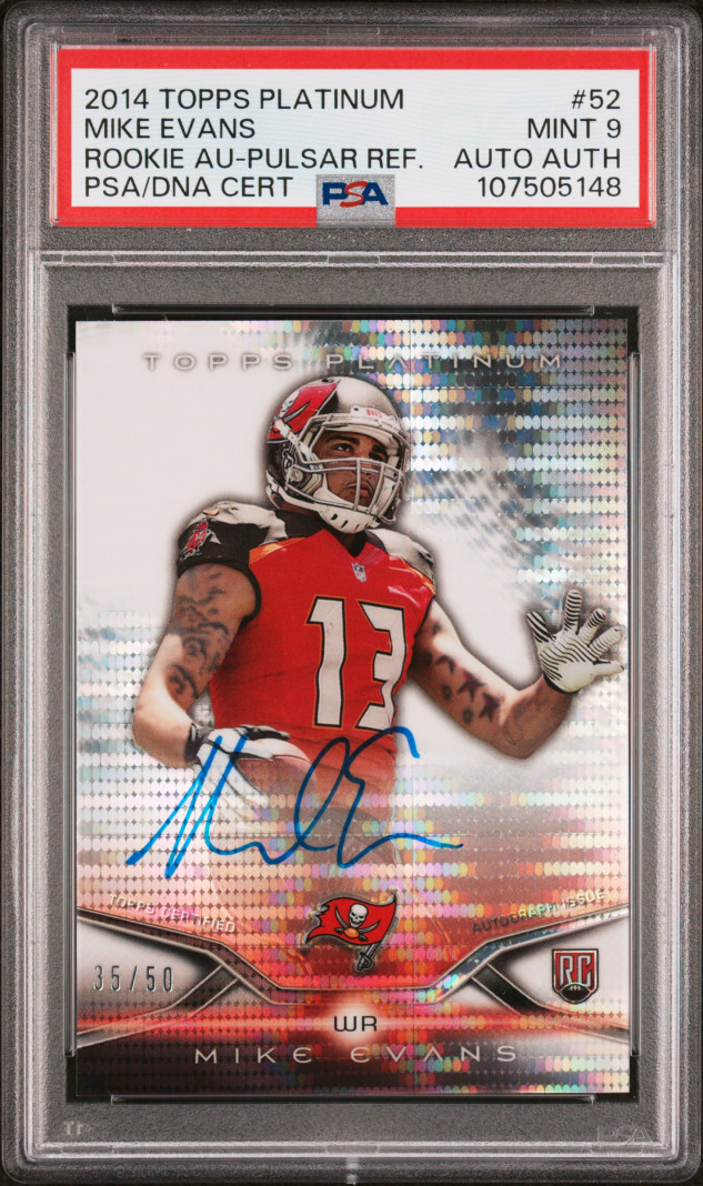 The product is a RARE 2014 Topps Platinum Mike Evans Rookie Card, autographed by the player himself. This Pulsar Refractor parallel card is serial numbered #35/50 and has been authenticated by PSA with grade of 9 MINT card, it is a highly collectible item for fans of the Tampa Bay Buccaneers and football enthusiasts alike. With a Super Bowl Champion theme and being part of the Platinum series, this card holds both monetary and nostalgic value for collectors.
