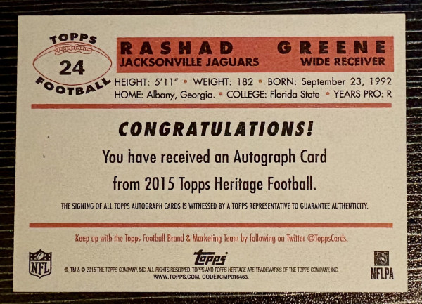 2015 Topps Heritage Rashad Greene #24 Rookie Auto RC