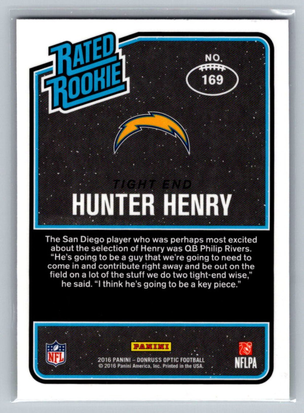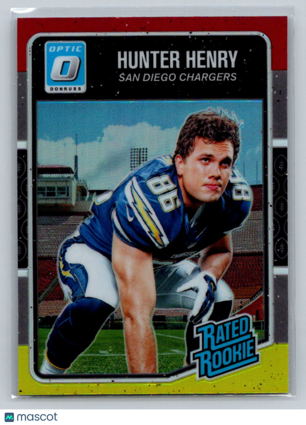 You are purchasing a 2016 Panini Donruss Optic Hunter Henry #169 Red and Yellow Rated Rookie San Diego Chargers. You will receive the exact item in the photographs. Thank you for looking.