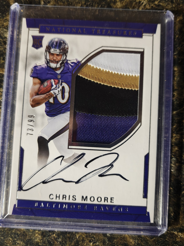 2016 National Treasures Chris Moore Autograph Rookie Card with a Player Worn Material Four Color Jersey.