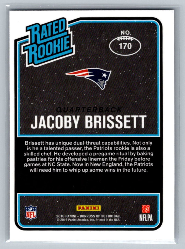 You are purchasing a 2016 Panini Donruss Optic Jacoby Brissett #170 Rated Rookie New England Patriots. You will receive the exact item in the photographs. Thank you for looking.
