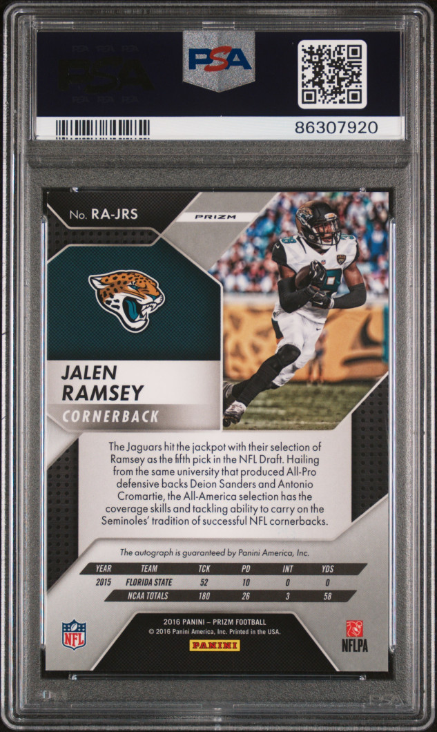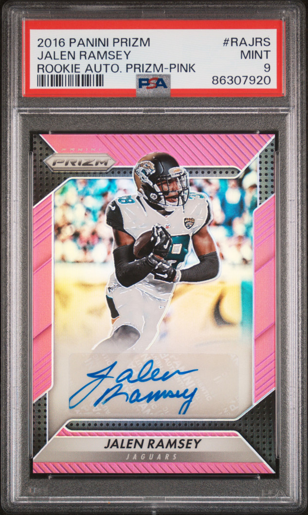 2016 Panini Prizm Rookie Autograph Prizm Jalen Ramsey Rookie Auto. Prizm-Pink PSA 9 Mint