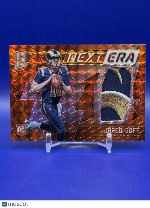Don't miss your chance to own this ultra-rare 2016 Panini Spectra Next Era Orange Patch RC of Jared Goff, numbered 1/3! This stunning card features a vibrant patch and is a must-have addition for any serious NFL or Los Angeles Rams collector. With only three of these cards in existence, it's a true gem for fans and investors looking to secure a standout rookie card from one of football's top quarterbacks.