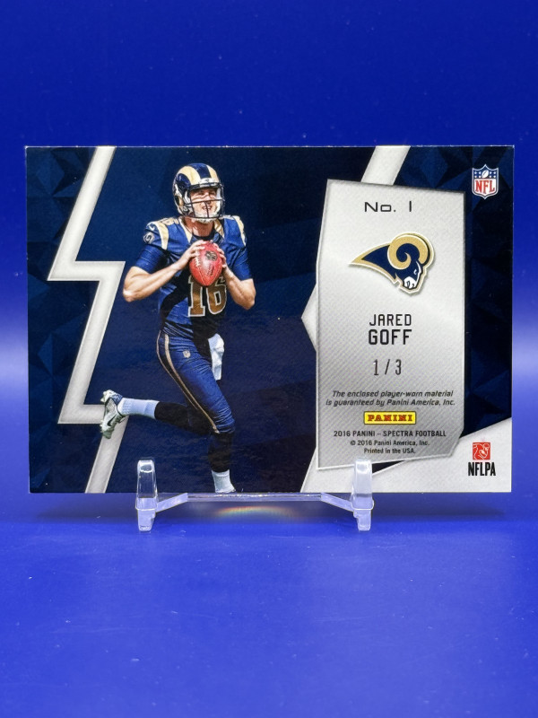 Perfect for display or investment, this card comes straight from the highly sought-after Spectra set and showcases Jared Goff in his rookie year. Secure this limited edition piece today and add a centerpiece to your football memorabilia collection before it's gone!