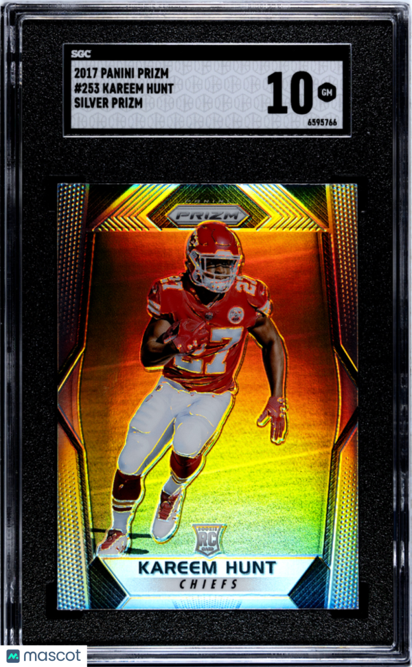 You are purchasing a 2017 Panini Prizm Kareem Hunt #253 Silver Rookie Kansas City Chiefs SGC 10. You will receive the exact item in the photographs. Thank you for looking.