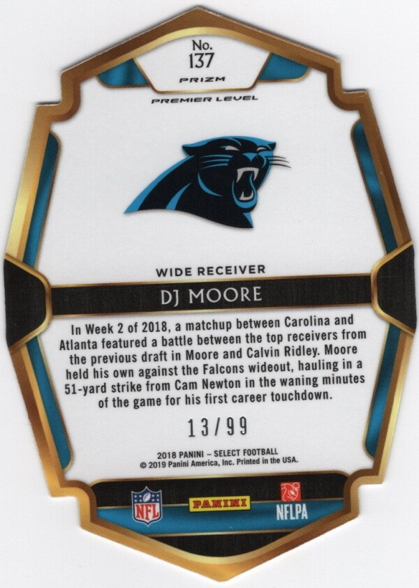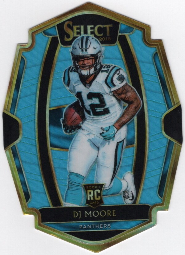 2018 Panini Select D.J. Moore Premier Level Light Blue Prizm Die-Cut Rookie #137 serial numbered 13/99. Clean-looking Panthers rookie in one of the better Select numbered die-cut parallels.