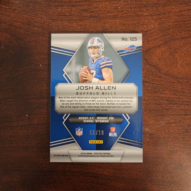 You are purchasing a 2018 Panini Spectra Prizm Josh Allen Gold. You will receive the exact item in the photographs. Thank you for looking.