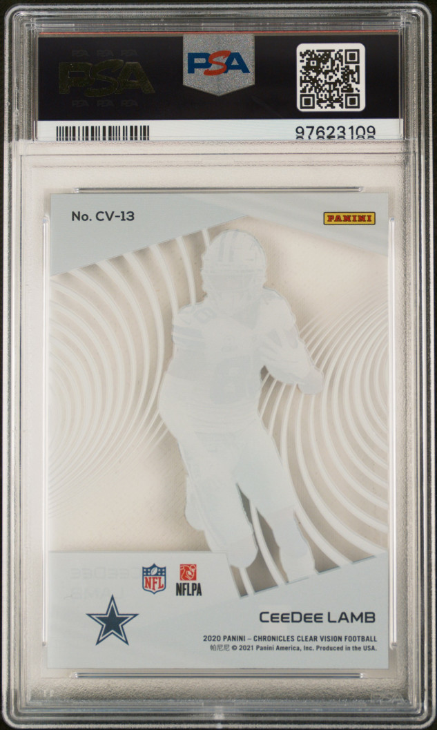 The product is a 2020 Panini Chronicles Clear Vision Rookies trading card featuring football player CeeDee Lamb. This card is part of the Clear variety set and has been professionally graded as a rookie card. It bears certification number 97623109 and comes from the renowned manufacturer Panini. The card is a valuable addition for collectors and fans of sports trading cards, especially those interested in rookie cards and football memorabilia from the 2020 season.