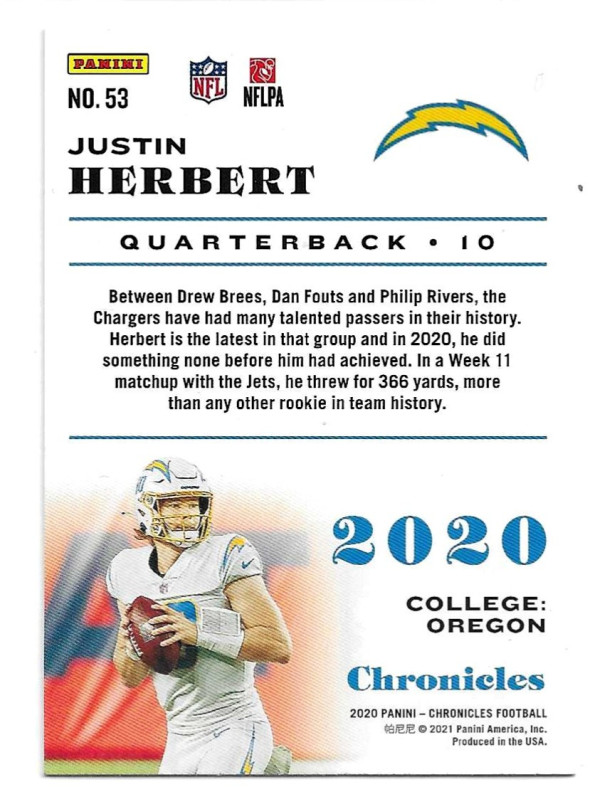 2020 PANINI CHRONICLES PINK #53 JUSTIN HERBERT (RC)