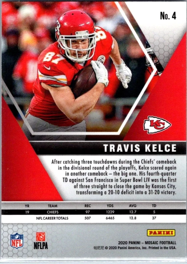 This is a nice example of a 2020 Panini Mosaic #4 Travis Kelce