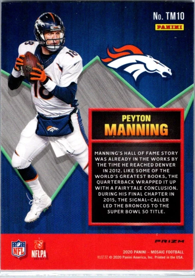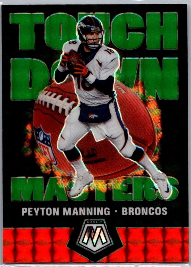 This is a nice example of a 2020 Panini Mosaic #TM10 Peyton Manning Touchdown Masters Prizm Green